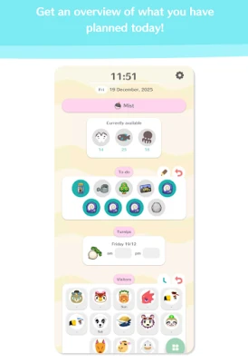 Navighează cu ușurință prin calendarul complex de evenimente, sărbătorind zilele de naștere ale sătenilor și marcând fiecare festival important. Cu Planner for AC: NH, ai la dispoziție liste de sarcini zilnice personalizabile, pentru a nu rata niciodată o recoltă sau o interacțiune valoroasă. Urmărește săptămânal vizitatorii insulei tale, de la artiști ambulanți la vânzători misterioși, și monitorizează fluctuațiile pieței de napi cu precizie. Mai mult, colecțiile tale vor fi complete datorită sistemului intuitiv de urmărire a progresului, iar ghidurile integrate pentru Redd, hibrizi, cadouri pentru săteni, insule misterioase, tururi cu barca și chiar programul TV îți oferă toate informațiile necesare, la îndemână.