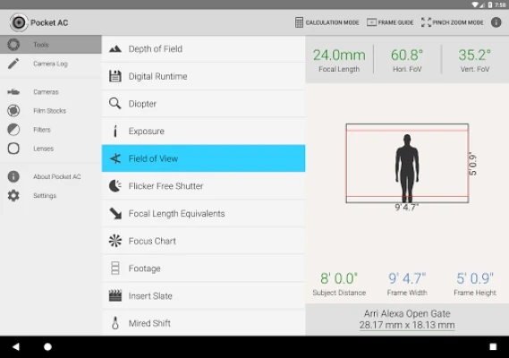 Descoperă **Pocket AC**, soluția indispensabilă concepută pentru fiecare cineast, director de imagine și membru al echipei de producție. Transformă complexitatea tehnică a filmării într-un proces intuitiv și eficient. Indiferent dacă ești pe platourile de filmare sau planifici următoarea scenă, **Pocket AC** îți pune la dispoziție instrumente precise pentru a calcula adâncimea câmpului, expunerea, unghiul obturatorului și câmpul vizual, oferind inclusiv previzualizări detaliate cu suport pentru reductoare focale. Nu mai lăsa loc de ghicit în arta cinematografiei.
