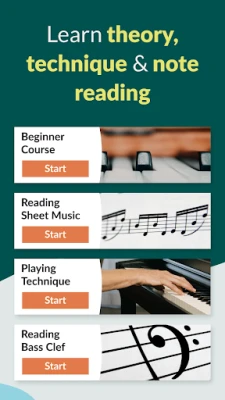 Aprofundează-ți cunoștințele de teorie muzicală, învață să citești notele și dezvoltă-ți tehnica pianistică într-un mod accesibil și captivant. Cu Skoove, poți cânta imediat melodiile pe care le iubești, de la hituri pop moderne semnate de artiști precum John Legend, The Beatles sau Adele, până la capodopere clasice de Bach, Beethoven și Mozart. Instrumente practice precum controlul tempoului și funcția de buclă îți permit să exersezi eficient, în timp ce videoclipurile explicative îți oferă claritate și înțelegere profundă.